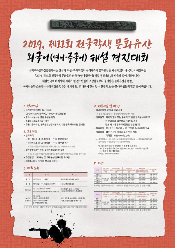 「2019, 제11회 전국 학생 문화유산 외국어(영어․중국어) 해설 경진대회」를 다음과 같이 개최합니다. 대한민국의